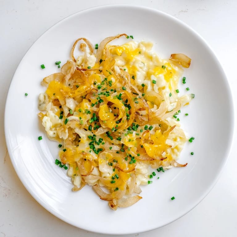 Merken Ein herzhafter und gemütlicher, von der deutschen Küche inspirierter Pfannengericht mit zarten Spätzle, karamellisierten Zwiebeln und geschmolzenem Käse, das unter dem Grill eine goldene, blubbernde Kruste erhält.