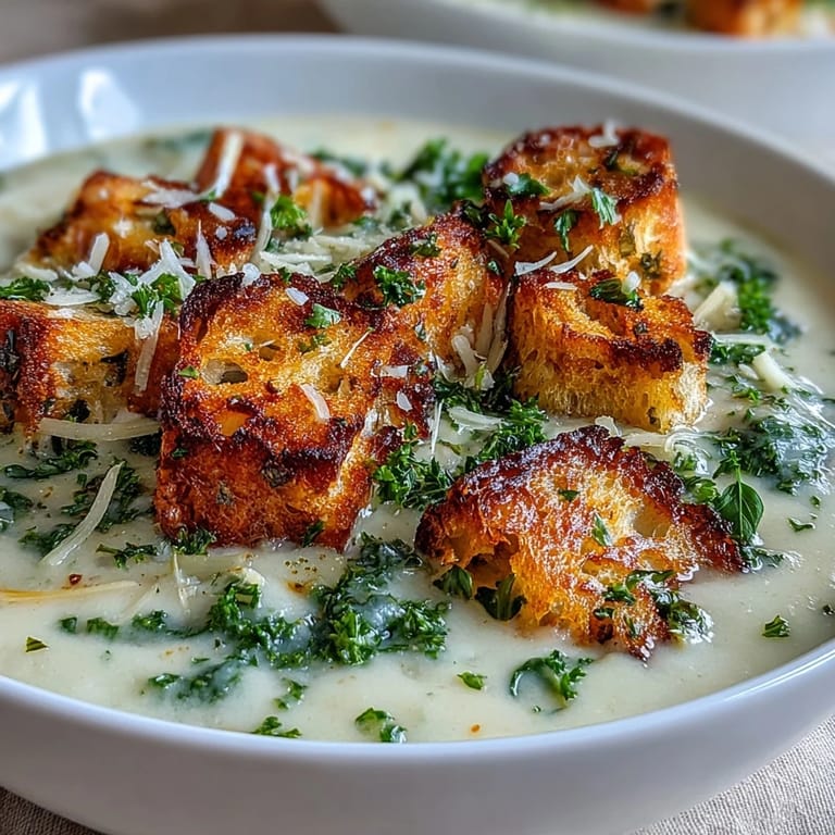 - Fülle die Suppe in vorgewärmte Schalen und kröne sie mit den knusprigen Croutons, frischer Petersilie und optional etwas geriebenem Käse. Genieße den Moment, wenn der erste Löffel der samtigen Suppe auf die knusprigen Croutons trifft.