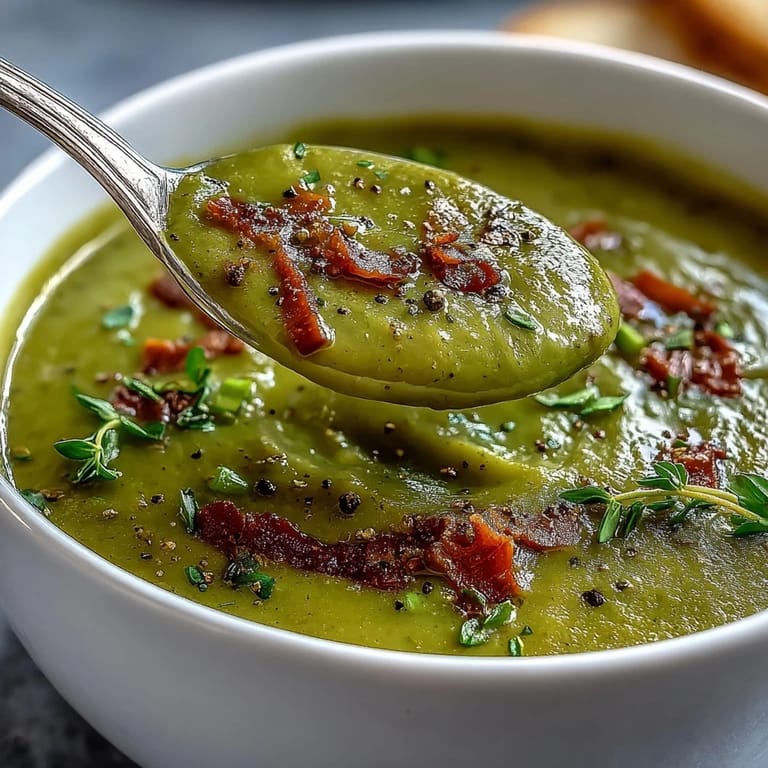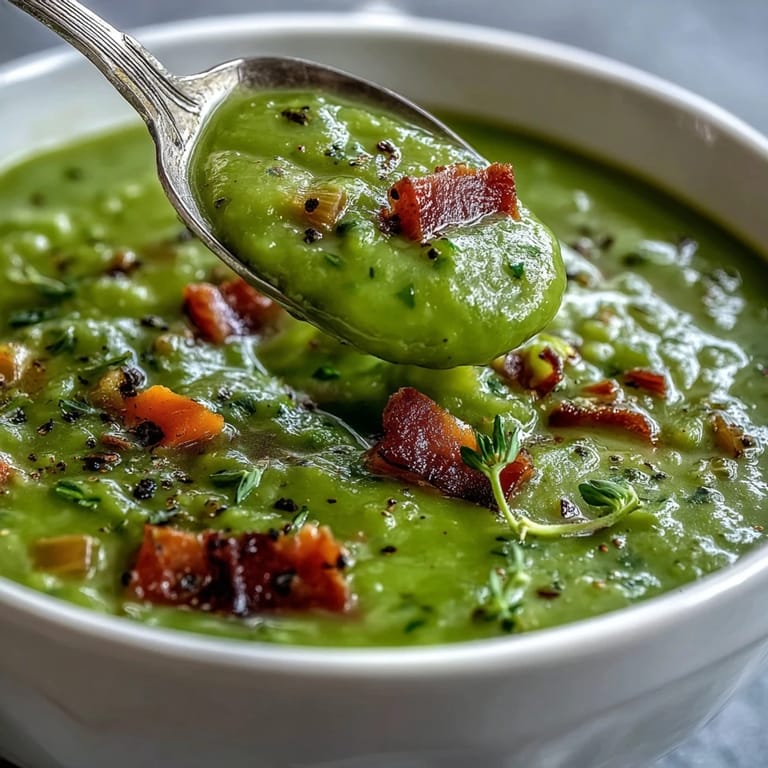 Merken A creamy, comforting traditional split pea soup perfect for winter warmth, packed with hearty vegetables and smoky flavors.