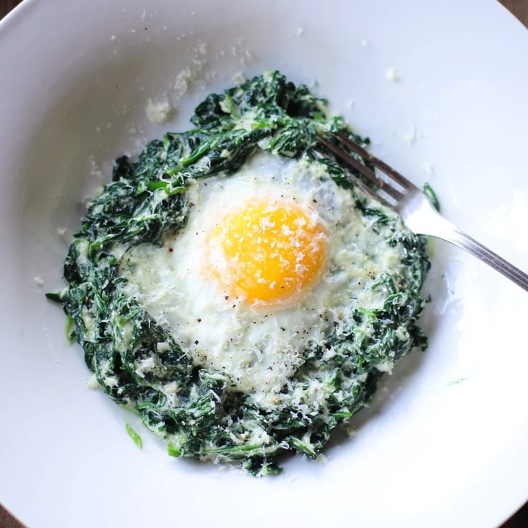 Merken Ein beruhigendes Gericht aus cremigem, knoblauchigem Spinat, garniert mit einem perfekt gebratenen Ei – eine sättigende Mahlzeit zum Frühstück, Mittag- oder Abendessen.