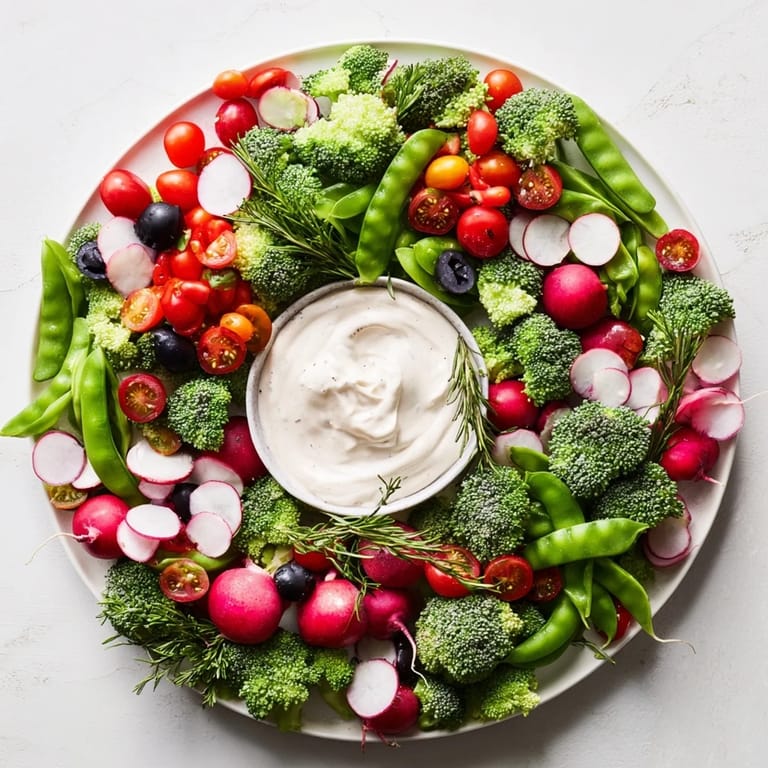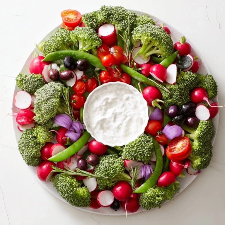 Merken Ein festliches und auffälliges Gemüseplattenarrangement in Form eines Weihnachtskranzes, serviert mit einem cremigen Ranch-Dip. Perfekt für Partys und Zusammenkünfte.