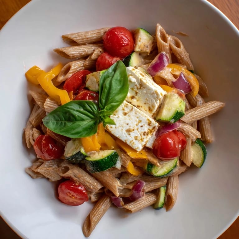 Merken Ich entdeckte dieses Rezept an einem regnerischen Nachmittag, als ich ein halb volles Glas Feta und eine Handvoll Gemüse im Kühlschrank fand. Das Ergebnis war so cremig und befriedigend, dass ich es jetzt regelmäßig mache, wenn ich etwas Warmes und Gesundes brauche, das sich weniger schwer anfühlt. Die Röstung der Gemüse schafft diese wunderbare karamellisierte Tiefe, während das Feta zu einer silbrigen Sauce wird, die alles zusammenbindet. Es ist das perfekte Gericht für einen entspannten Abend, an dem ich trotzdem ein echtes Restaurant-Erlebnis möchte.