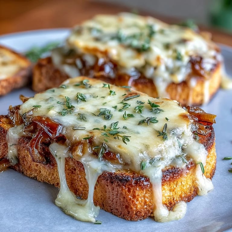 - Ladle soup into oven-safe bowls, top each with one or two crostini, and optionally place under the broiler for 1-2 minutes for that extra melted, slightly browned cheese pull. Serve immediately while the crostini is still crispy underneath.