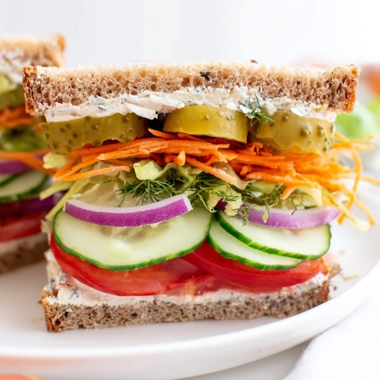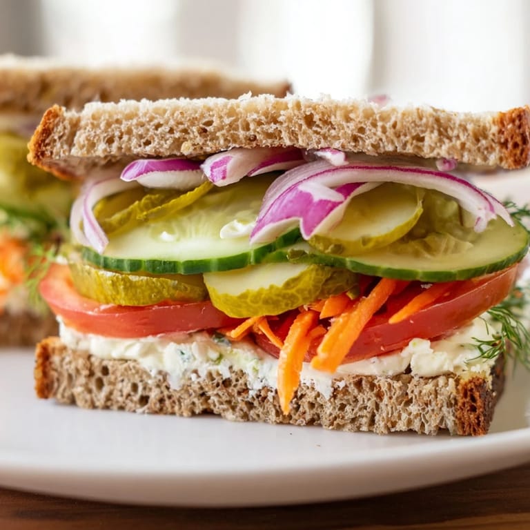 Merken Ich war an einem besonders heißen Sommertag in der Küche meiner Großmutter, als sie mir zeigte, wie man ein Sandwich nicht einfach nur zusammenschmiert, sondern komponiert wie ein Kunstwerk. Sie nahm eine Dose eingelegte Dill-Gurken heraus und sagte mit einem Lächeln: "Das hier ist die Geheimwaffe." Seitdem verstehe ich, dass die beste Mahlzeit manchmal die einfachste ist – vollgepackt mit knackigen Gurken, frischen Gemüsen und einem cremigen Aufstrich, der alles zusammenhält.
