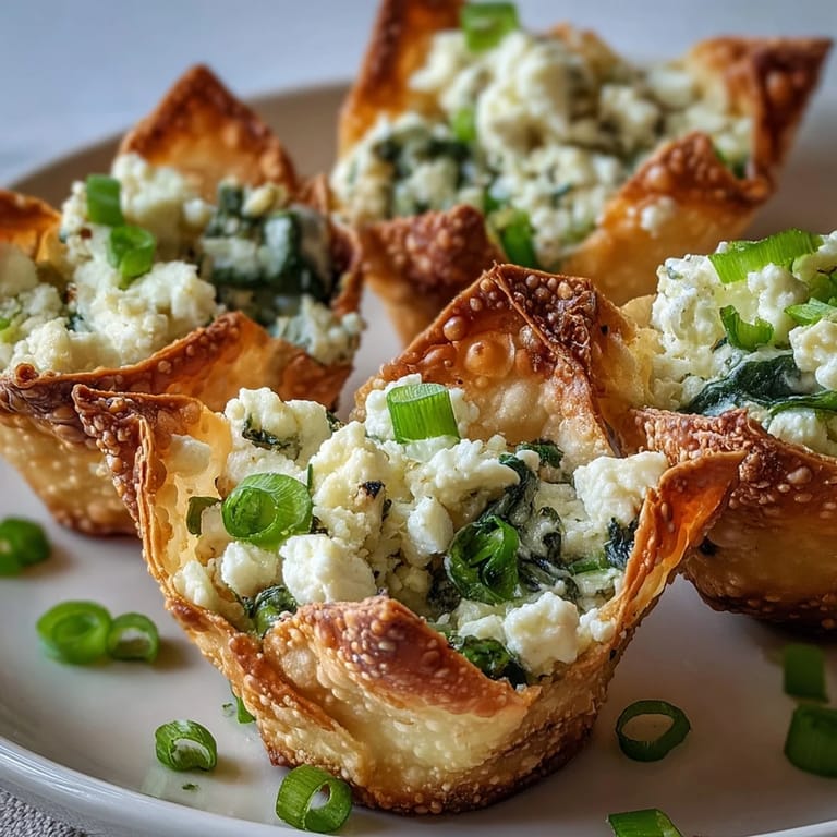 Merken My neighbor Maria showed up with a platter of these crispy wonton cups one evening, and I watched guests devour them like they were disappearing coins in a magic trick. The combination of Greek and Asian flavors seemed like it shouldn't work, but somehow the salty feta and spinach wrapped in those golden, shatteringly crisp shells made perfect sense. She refused to share her recipe that night, but eventually gave in after I promised to make them for her book club. Now I understand why she guarded it so carefully—these little cups have become my secret weapon for impressing people without much effort.