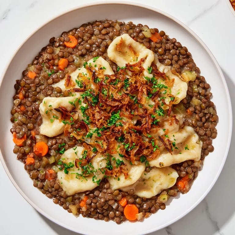 Merken Eine herzhafte, wohltuende Schüssel mit zarten Linsen und klassischen deutschen Spätzle, vereint mit aromatischem Gemüse und wärmenden Gewürzen – perfekt für eine sättigende, budgetfreundliche Mahlzeit.
