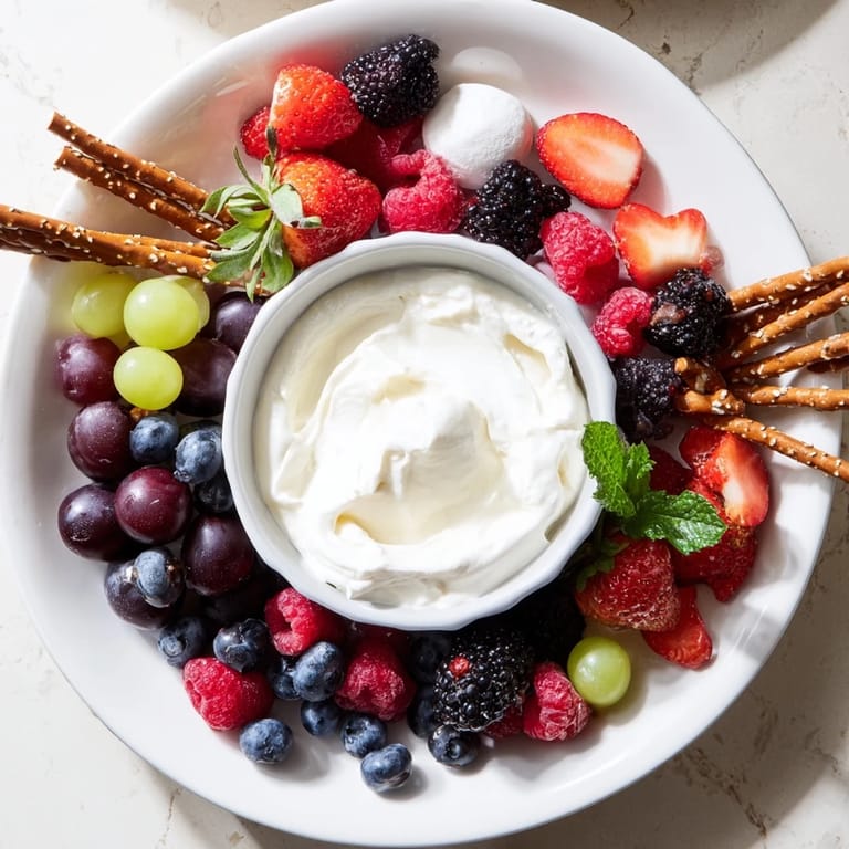 Merken Eine festliche und lebendige Platte mit frischen Beeren und einem köstlichen, cremigen Dip – perfekt für Feiertagsversammlungen oder ein fröhliches Dessert.