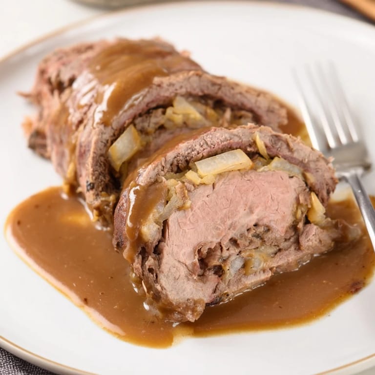 Merken Zarte Rindfleischscheiben wurden um herzhafte Speckstücke, Zwiebeln, Senf und saure Gurken gerollt und in einer reichhaltigen Soße geschmort. Ein klassisches deutsches Komfortgericht, perfekt für besondere Anlässe oder deftige Familienessen.