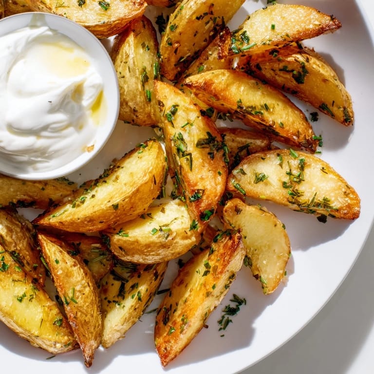 Frische Kräuter wie Petersilie, Schnittlauch, Thymian, Rosmarin und etwas getrockneter Oregano verleihen den Kartoffelspalten ein aromatisches und vielschichtiges Aroma.