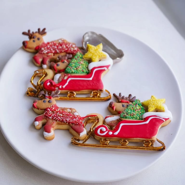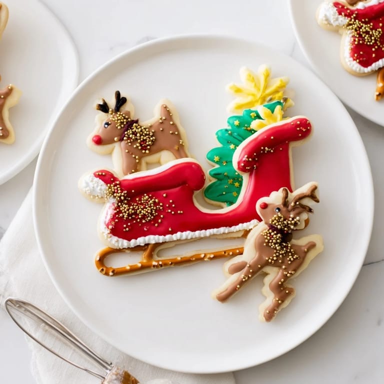 - Ausgekühlte Plätzchen mit farbigem Royal Icing, Streuseln und essbaren Dekorationen verzieren. Details auf Schlitten, Rentier, Santa und Akzente spritzen. Mindestens 2 Stunden trocknen lassen.